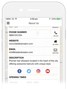 Provide contact details, directions, social links and your opening hours from one easy to access tab.